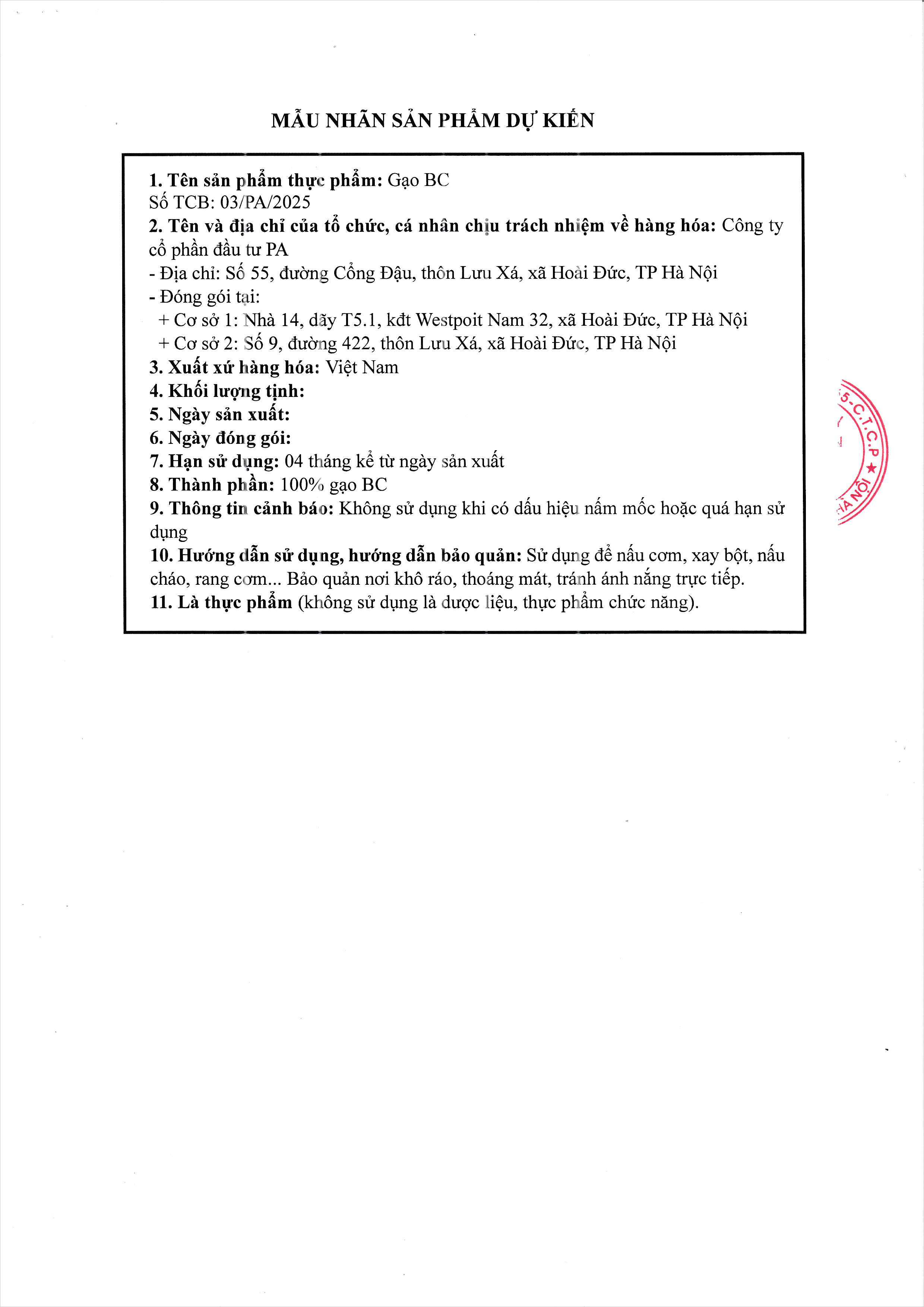 - Quy cách đóng gói: 10kg, 25kg, 50kg